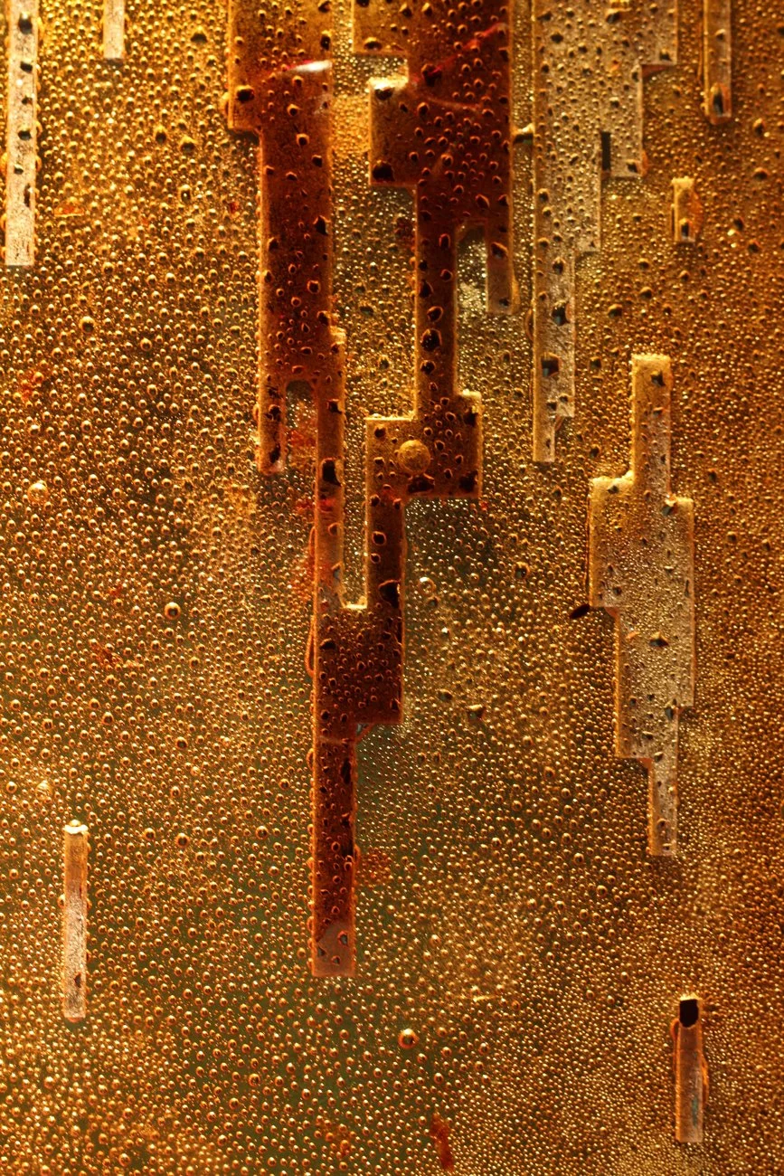 Des stèles de caramel fabriquées à partir de sucre raffiné issu de l’industrie sont produites en série, selon une technique d’assemblage directement issue de la marqueterie, les teintes et imperfections de chaque pièce soulignent alors la tension entre standardisation et singularité.