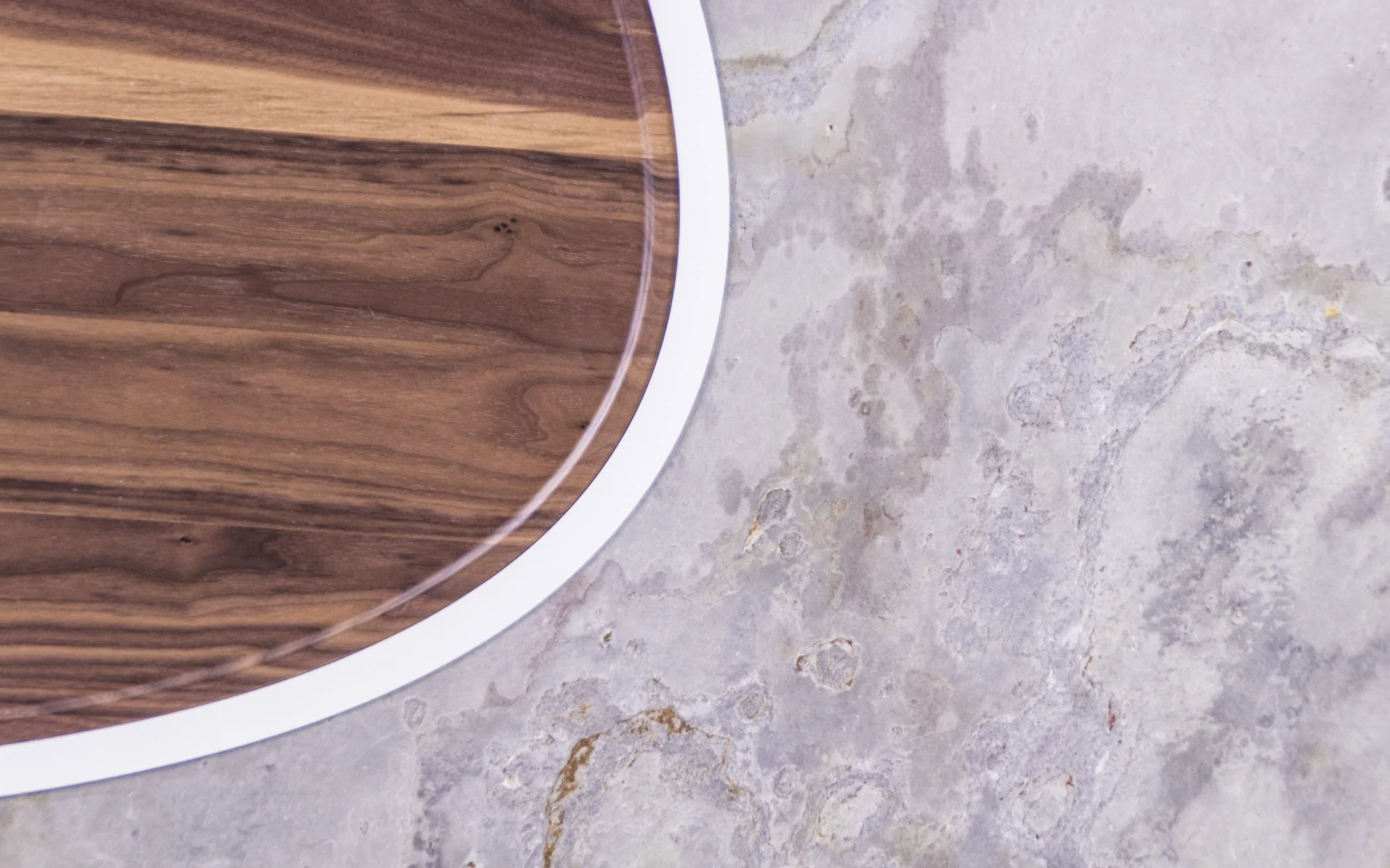 L’originalité de cette table basse se caractérise à la fois par des lignes souples, avec des formes courbes, mais également par son piètement. En effet, la traverse principale est positionnée entre les deux parties du plateau, ce qui créer un impact visuel fort entre le bois et la pierre et contribue à cette impression de légèreté.