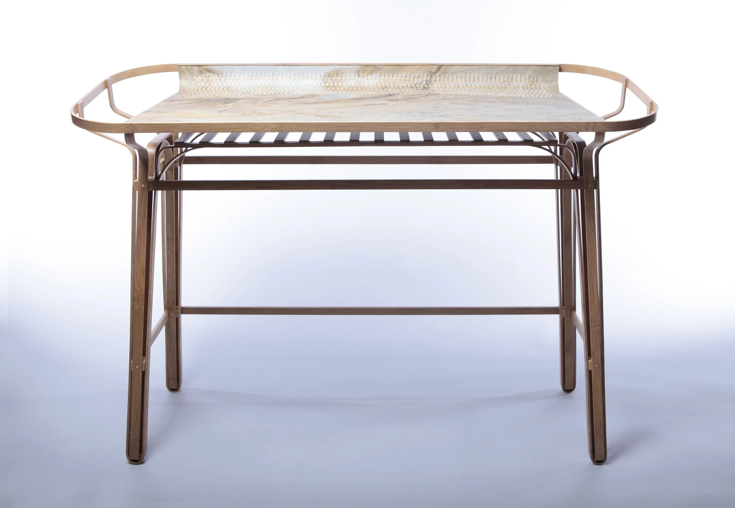 Conçu dans le cadre de la résidence Hand in Hand à Taïwan, Silhouette est une collaboration entre Dimitry Hlinka et Lin Jiang-Cheng, maître artisan spécialiste du cintrage de bambou dans la région de Nantou. Le projet explore les qualités structurelles du bambou laminé. Pensé comme un système reproductible, le piètement repose sur l’emboîtement de deux éléments cintrés identiques. Le plateau en feuille de pierre, volontairement souple, s’adapte aux courbes du bambou, instaurant un dialogue entre matière végétale et minérale.