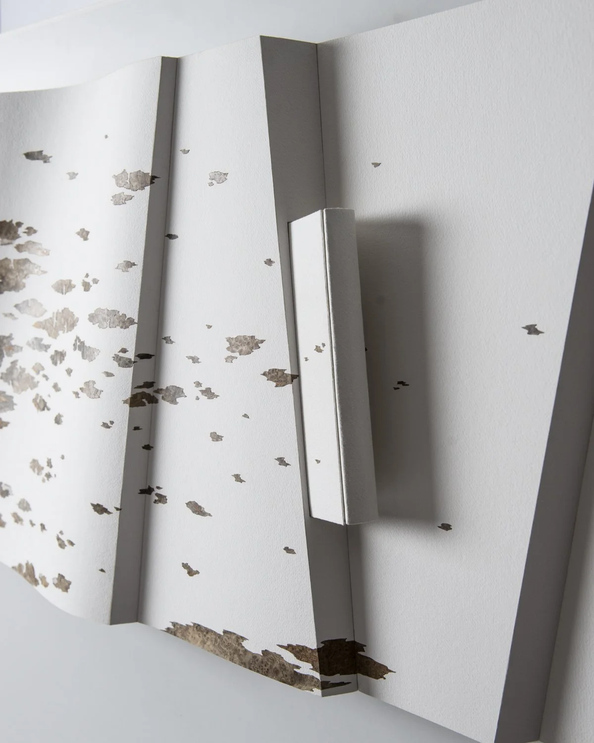 Souvenir résiduel est un panneau ornemental conçu comme un écrin, à la croisée de la marqueterie et de l’objet narratif. Il met en scène le parcours symbolique du bois : de l’écorce brute au papier. L’objet invite à une lecture aussi littérale que métaphorique du livre.