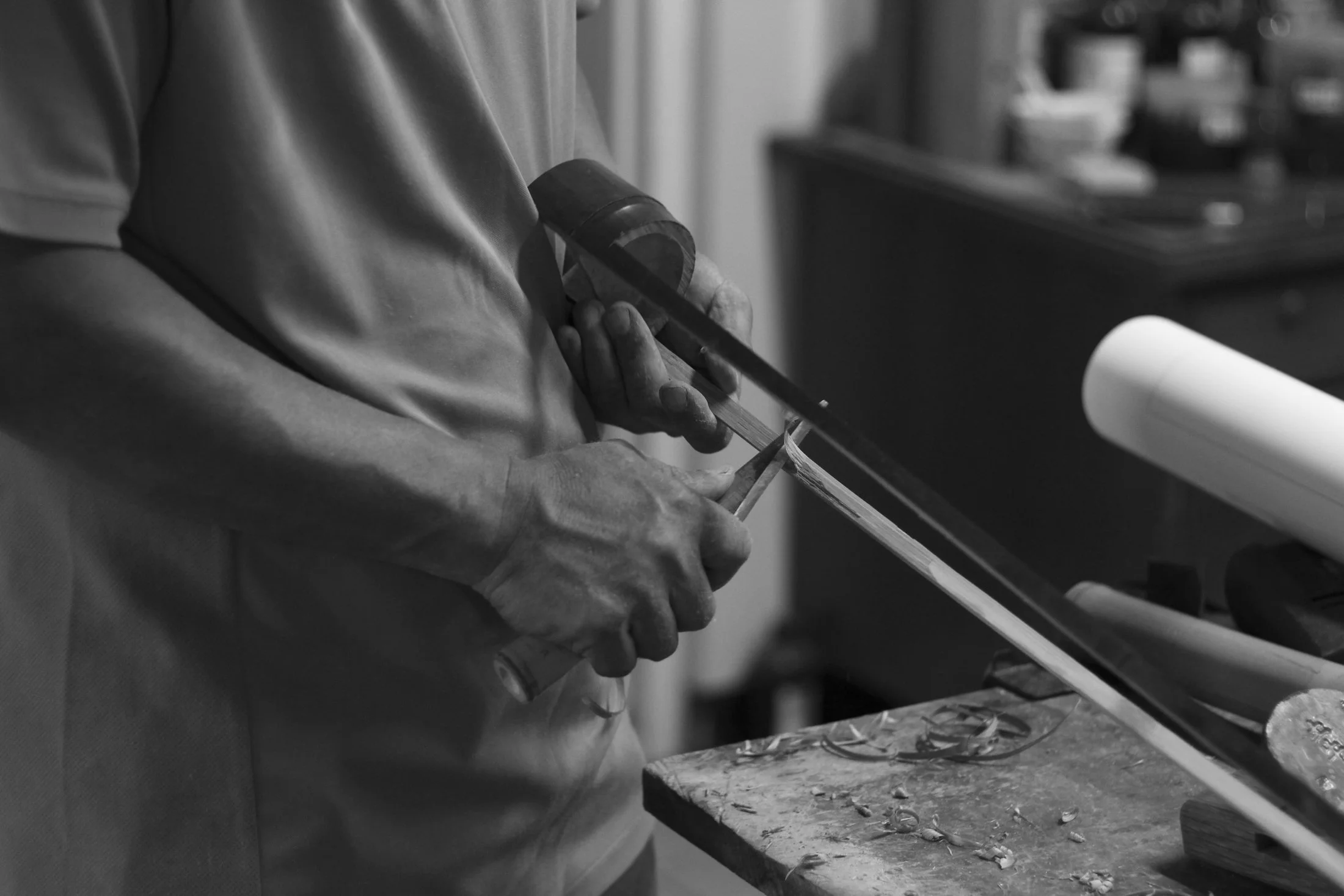 Cintrage à chaud de bambou laminé, découpe de feuille de pierre sur gabarit.
