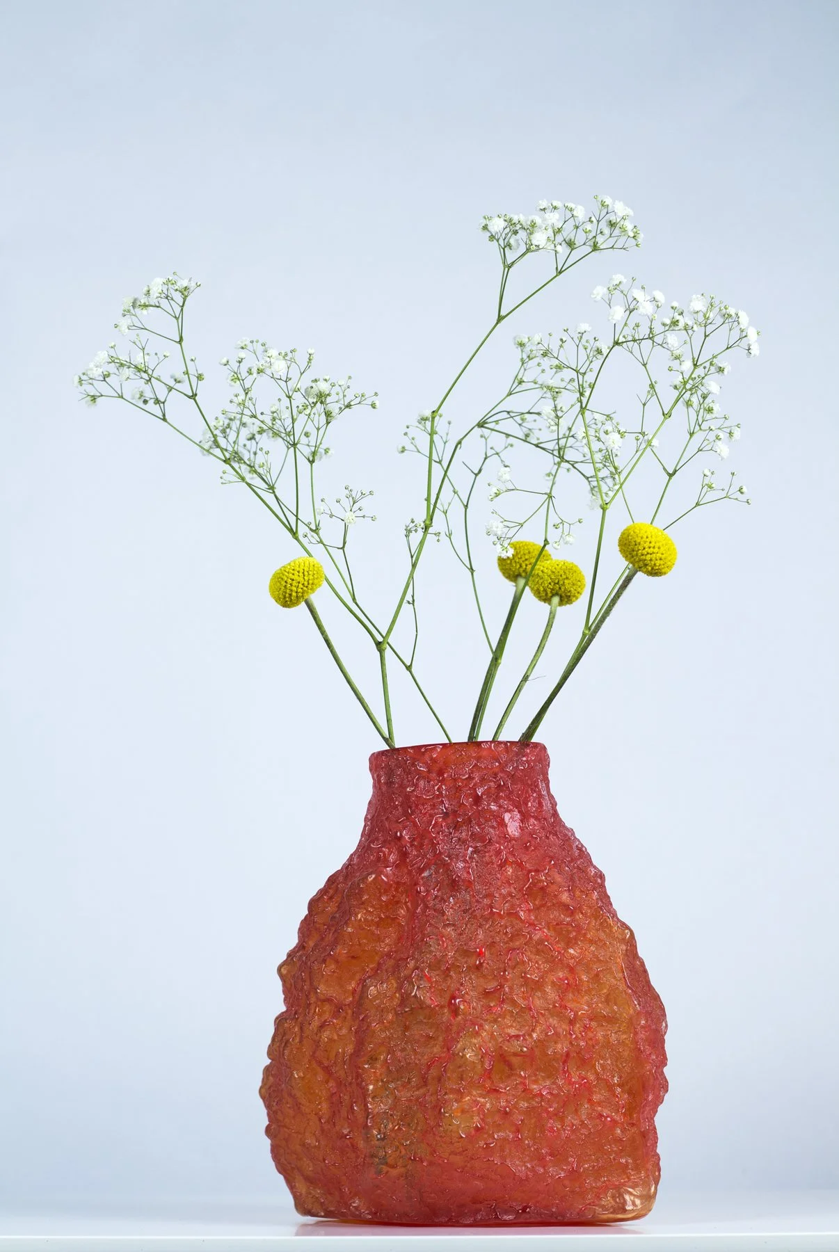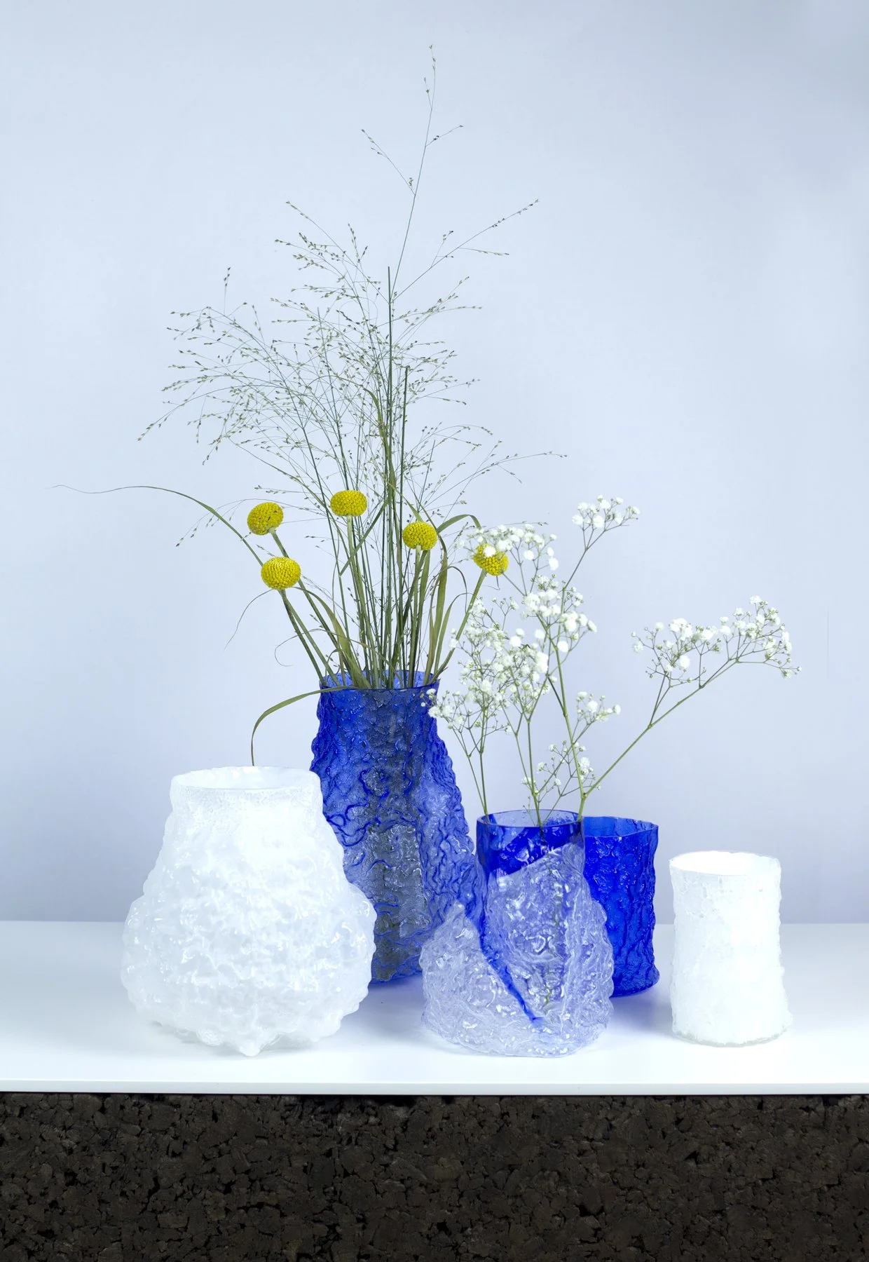 Les Vases Frimaire sont nés d’une série de tests autour du liège expansé, utilisé ici comme moule éphémère dans le processus du soufflage de verre. En contact avec le verre chaud, le liège se consume, donnant naissance à des formes uniques marquées par la texture et les aspérités de leur moule d’origine.